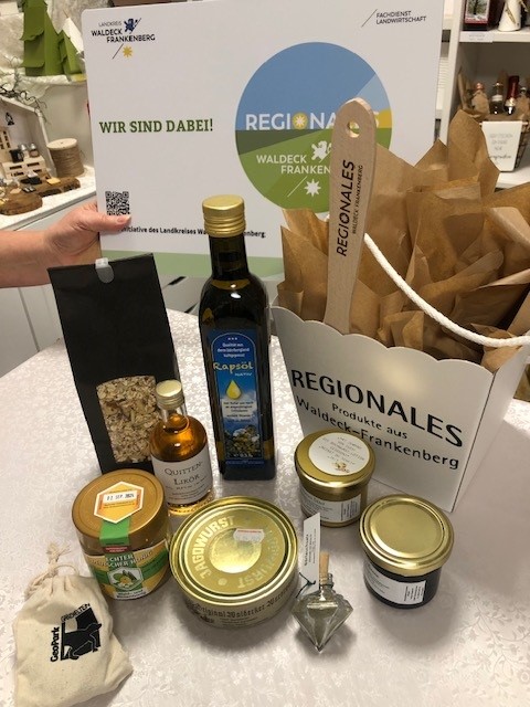 „Gerade rechtzeitig, bevor das Weihnachtsgeschäft so richtig losgeht, haben der Geopark GrenzWelten und unsere regionale Direktvermarktung die Idee für den Korb umsetzen können“, lobte der Landrat den Einsatz. Ab sofort ist der Paläokorb nach telefonischer oder E- Mail-Bestellung zum Preis von 35 Euro bei der Spezialitätenmanufaktur Bangert in Korbach- Meineringhausen erhältlich.Die sogenannte Paläo-Diät ist Vielen schon ein Begriff; für alle, die sie noch nicht kennen: Sie bezeichnet eine Ernährung, die insbesondere Lebensmittel vorsieht, wie sie unsere Urahnen in der Steinzeit gegessen haben. Dazu zählen pflanzliche Produkte wie Linsen, Datteln und Beeren; auch tierische Produkte aus Fleisch sowie Honig und Nüsse stehen im Einklang mit dieser Ernährung. Mit dem neuen „Paläo-Korb“ greifen der Nationale Geopark GrenzWelten und Regionales Waldeck-Frankenberg den Diättrend auf. In Zusammenarbeit mit der Spezialitätenmanufaktur Bangert wurde ein Geschenkkorb konzipiert. „Natürlich muss man den Inhalt im übertragenen Sinne betrachten, denn auch ein leckerer Schnaps aus Datteln ist enthalten. Diesen Luxus hatten unsere Vorfahren in der Steinzeit sicherlich noch nicht“, erklärt Kim Peis vom Geopark-Projektbüro mit einem lachenden Auge. Zusätzlich zu den regionalen Leckereien enthält der Korb noch ein erstaunliches Geschenk des Geoparks: Eiswürfel-Steine. Diese werden einfach ins Gefrierfach gelegt und kühlen Getränke, ohne sie zu verwässern. „Neben dem thematischen Bezug steht vor allem die Regionalität im Fokus“, betont Dorothea Loth von Regionales Waldeck-Frankenberg, Fachdienst Landwirtschaft. „Alle Produkte stammen aus der Region, was den Korb nicht nur zu einem leckeren, sondern auch zu einem nachhaltigen Geschenk macht“.